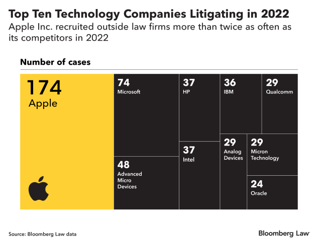 The firm represented major tech companies in 52 federal lawsuits over the year, the most of any law firm, according to a Bloomberg Law analysis. Most of those cases were for Apple Inc., and several proceedings appear to have been consolidated.